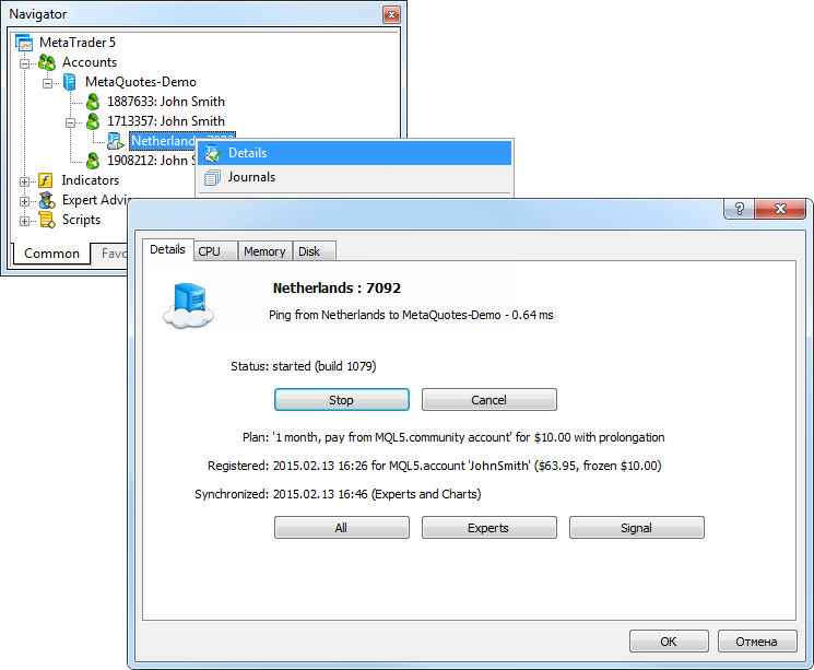 The rented virtual server status can also be easily monitored from the client terminal. Execute "Details" command in the context menu.